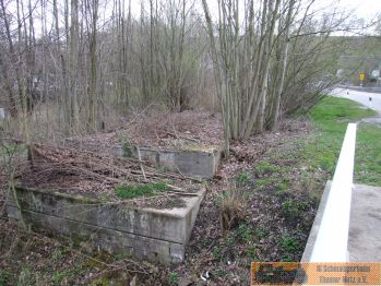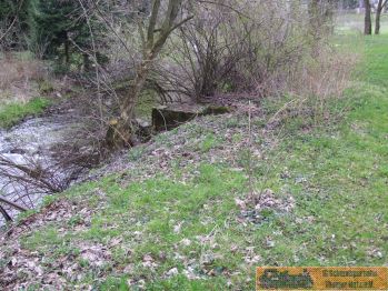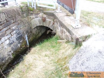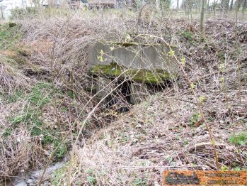 Die Röhrgrabenbrücke ist nicht mehr vorhanden. Im anschließenden Feld ist ebenfalls nichts mehr zu sehen. Der Graben ist an dieser Stelle mit geraden Platten abgedeckt und nicht verrohrt. Die Brückenlager sollten zu erkennen sein.