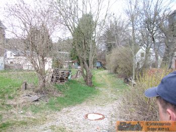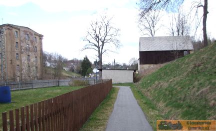 Von der August-Bebel-Straße gehen sie hinunter zur Schillerstraße in südliche Richtung. Hier müssen sie kurzzeitig der Schillerstraße folgen. Auf Höhe der Goethestraße (rechts) biegen sie nach links und gelangen zurück zum Bahndamm. Hier ist dieser mit Garagen zugebaut worden. |