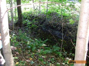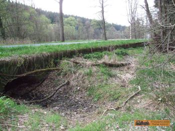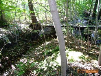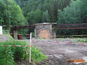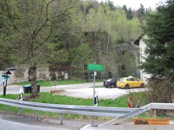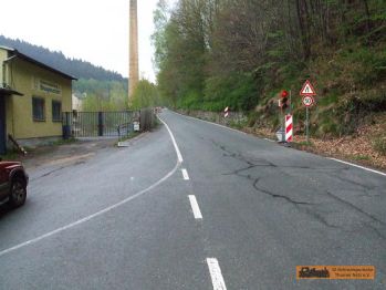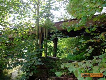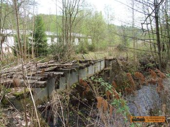 Der Werksanschluss der Papierfabrik ist nur noch durch eine kaputte Brücke zu erkennen. Die Fabrik selbst ist links vom Straßenverlauf nur noch als "Schutthaufen" zu sehen! |