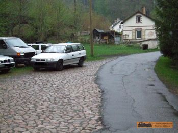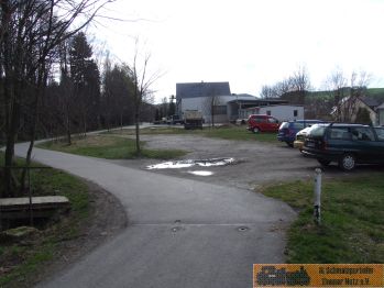 Die Asphaltstraße geht dann auf die Bahnhofsein & Ausfahrt. Rechts Zurück (hinter dem Auto) war der Werksanschluss. |