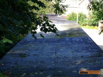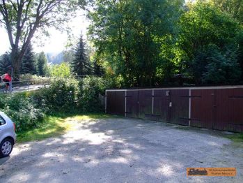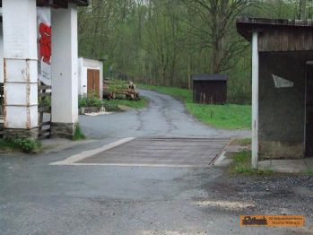 Um zurück zur Bahnstrecke / Anschluss Eduard Kühn zu gelangen, geht es auf Höhe "Waldhotel Schlösschen" links die Einfahrt hinunter. Über eine alte Fahrzeugwaage, via Brücke, zum alten Bahndamm. |