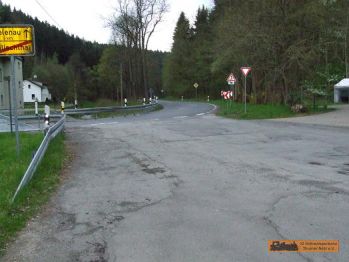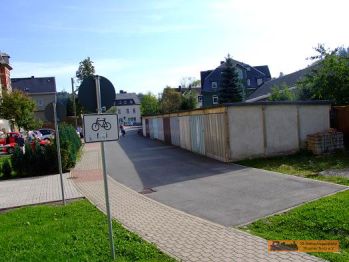 An der Straßenkreuzung S232 (Annaberger Straße / Zschopauer Straße) und der K8106 (Drehbacher Straße) geht es nach links. Nach ca. 70m war der Bahnübergang. Bei den Garagen führte die Strecke nach rechts. |