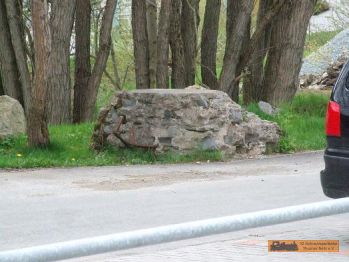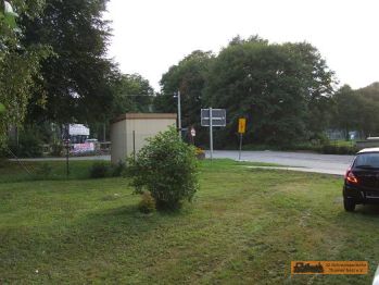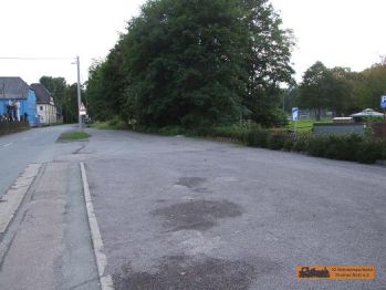 Vom Wartehäuschen ist nur noch das Fundament zu sehen. Der Streckenverlauf ist hier asphaltiert. Ein Steindurchlass ist noch vorhanden. Um die Ecke ist ein "Eiscafe"! |