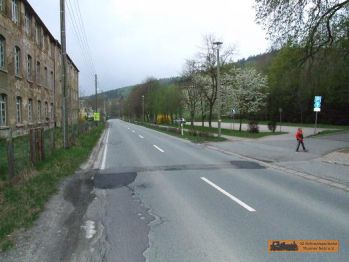 Folgt man der S231 links in Richtung Gelenau ca. 150m, erreicht man den 1. Bahnübergang der Wilischthalbahn. Die Schienen erkennt man noch im Asphalt.